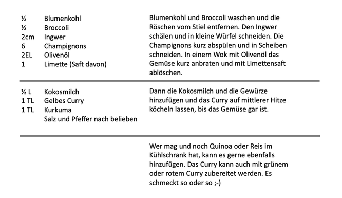 Egal, ob mit gelbem, grünem oder rotem Curry, auch wenn du noch Ingwer hinzufügst oder es scharf mit Chili ergänzt. Ich finde, so ein Curry schmeckt immer gut, und für mich ist es irgendwie Gaumen-Wellness.