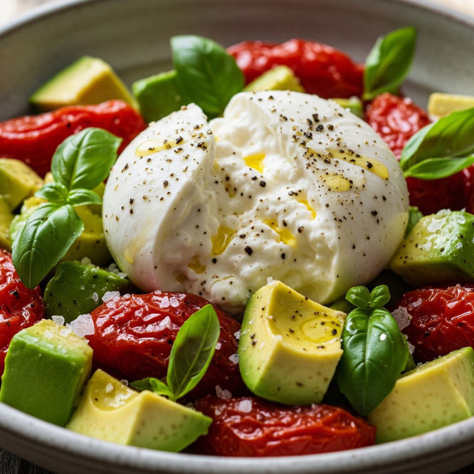 Hier kannst du das Avocado Tomaten Salat mit Burrata Rezept Downloaden