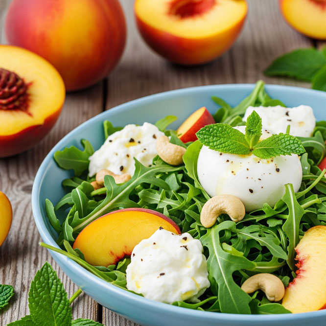 Hier kannst du das Ruccola Pfirsich Salat mit Burrata Rezept Downloaden