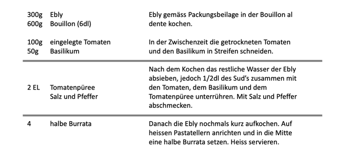 Ebly ist so ein Korn, das man ständig vergisst. Und wenn man es dann wieder entdeckt, denkt man: „Warum eigentlich?“ Kalt, als Salat, ist es wie ein kleiner Kurzurlaub am Mittelmeer. Heiss, mit Tomaten und einer frischen Burrata, wird es zur Liebesaffäre auf dem Teller. Ehrlich: Da könnte ich mich reinlegen. Und vielleicht einfach liegen bleiben. Der Rest des Sommers darf dann ruhig ohne mich weitermachen.