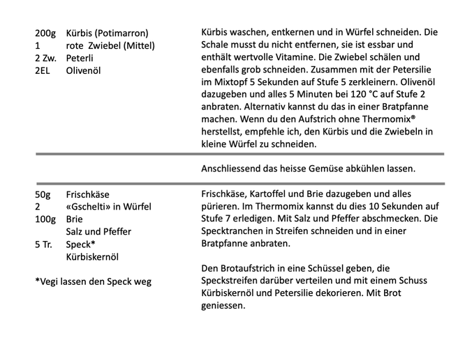 Wenn die Tage kürzer werden und der Kürbis an allen Ecken sichtbar ist, schmeckt dieser cremige Brotaufstrich auf frisch gebackenem Brot besonders gut. Ein Aufstrich, der bei uns bei keinem Brisolée fehlen darf.