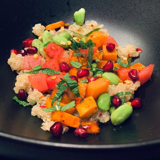 Nicht gerade schnell gemacht, aber es lohnt sich. Die Kombination mit der Süsskartoffel finde ich erfrischend, auch wenn es sich nicht so anhört. Vielleicht ist es auch die Abrundung mit der Minze und den Granatapfelkernen, die im Kopf ein Erlebnis auslöst, als stünde man unter einem Wasserfall.