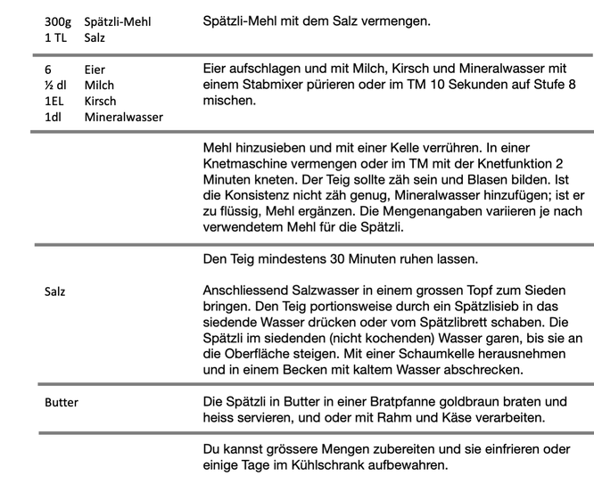 Spätzli gehen immer. Auf der Rigi haben sich meine Gäste sogar vorab zum Spätzliessen angemeldet. Gekaufte Spätzli sind keine Option. Mit diesem Rezept wirst du sie gerne immer wieder selbst zubereiten.